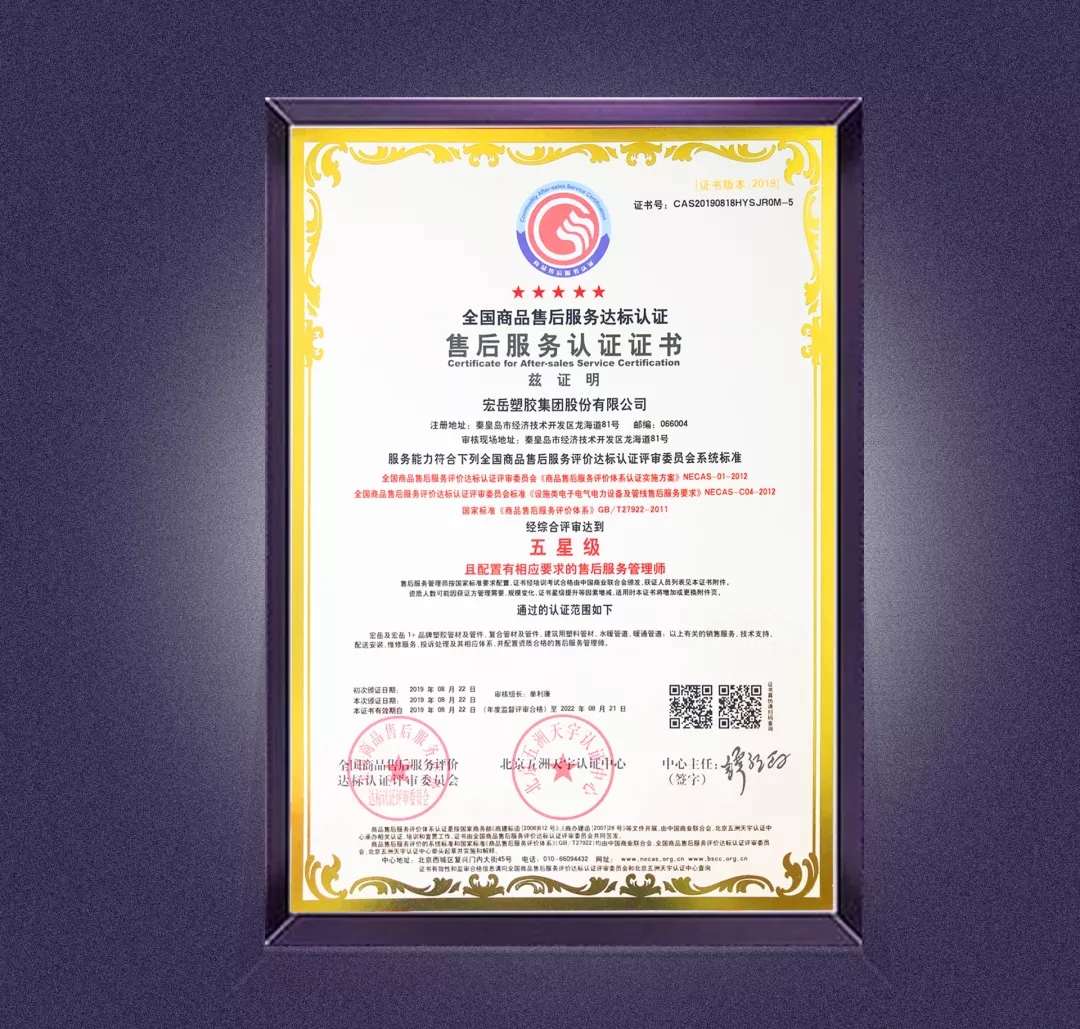 8月22日,乐鱼塑胶集团股份有限公司通过全国商品售后服务达标认证,获得五星级售后服务认证证书。